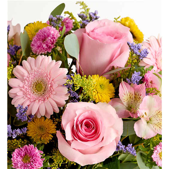 Spring is a time to refresh and reach out. Our spring bouquet celebrates that sentiment. Pastel pink and yellow blooms are loosely gathered with lush greenery for style and texture. Designed in our rustic, gray-washed wooden cube, it’s a gift that delivers on your feelings in the most beautiful way.
